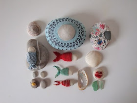 I recently found knitalatte's shop on etsy and what I love love love about her photographs is that she took something familiar, like the still life, and did something odd to it - she photographed rocks. In sweaters. Sounds silly, but how cool are her pictures? The sweater patterns look like flowers, spider webs, snow flakes and with the combination of colors and patterns and juxtaposition of objects - each of these images tell such a story. I'm glad the artist thought: why not? because the discovery of these pictures makes me very happy.