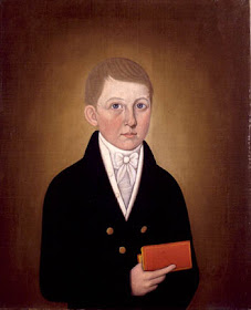 (1766-1854) was a deaf New England painter of portraits. He did portraits of his own family members, other adults and also painted people in pairs, but I like his solitary children. They look serene, yet world-weary. Maybe it's in the seriousness of their eyes or a type of tension in their bodies in having to hold up a rose, a red book, a piece of fruit, a bird by a string.