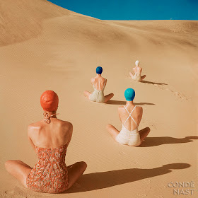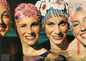 Yeah, I know... In my current condition, I'm not one for hanging out on a hot beach or crowded pool in a swimsuit of any kind. And with my pinhead, I am also someone who should never - and I mean never EVER - wear a swim cap. And yet I punish myself by being drawn to these vintage pictures of bathing beauties in the prettiest of swim caps. I wish being at the beach could still look this lovely...